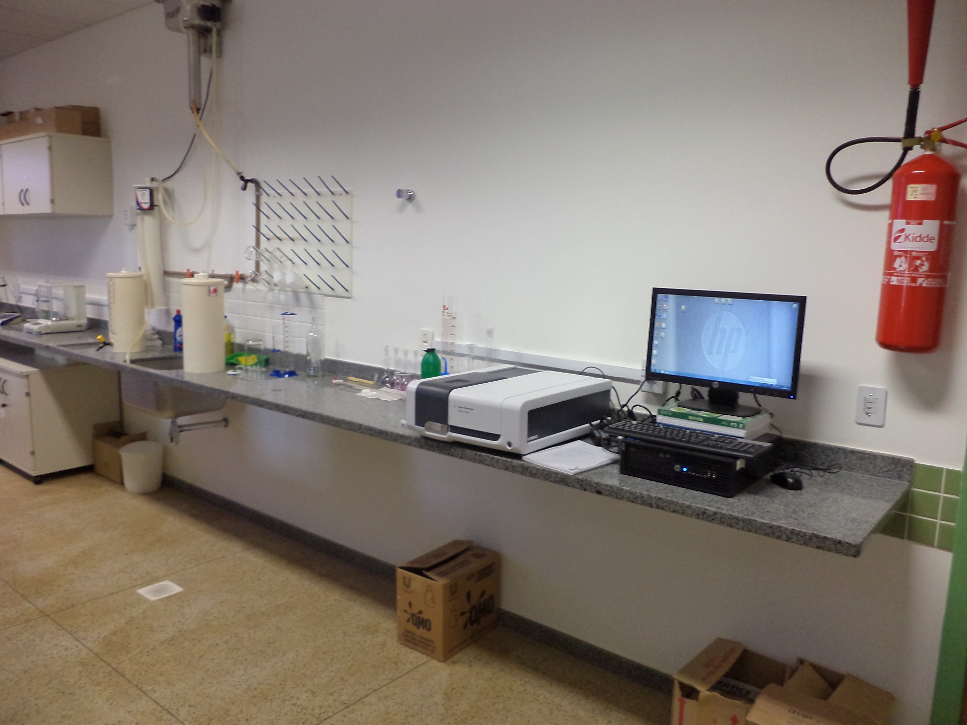 Laboratório conta com sistema de ar-condicionado. E extintores de contra incendio.