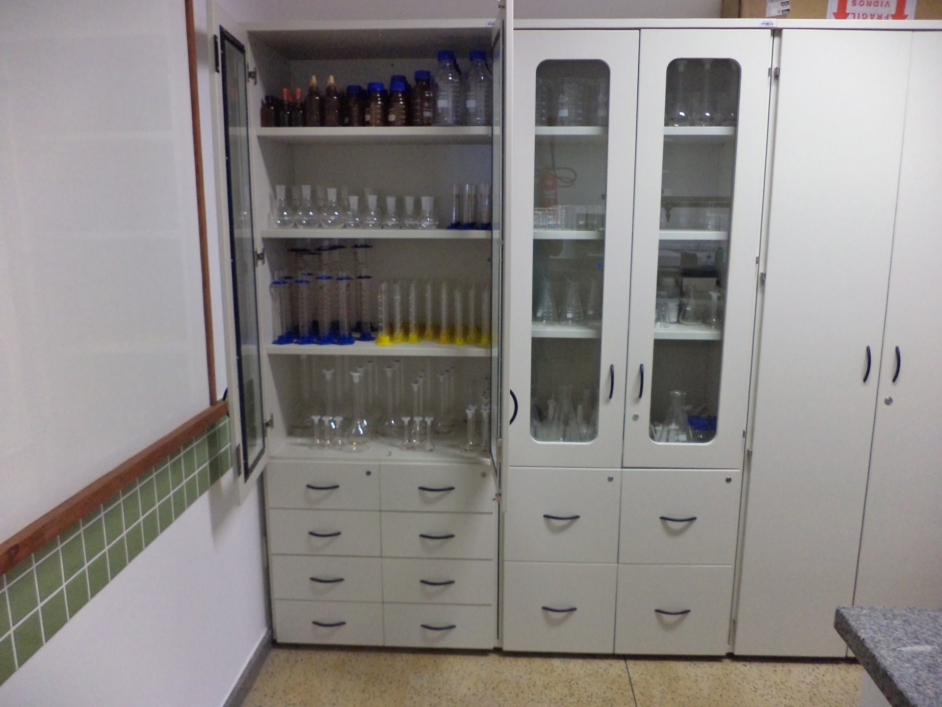 Para os experimentos de química o laboratório conta com diversas vidrarias e de muitos compostos reagentes.